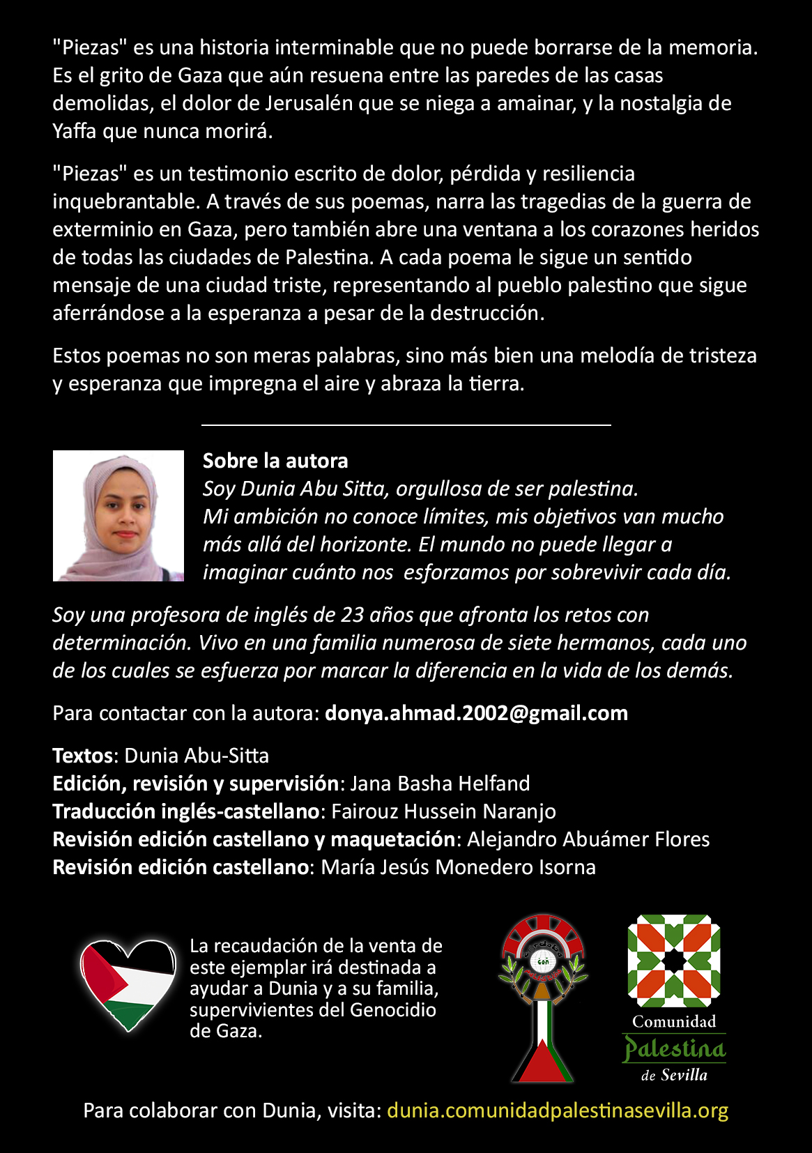 La recaudación de la venta de este libro irá destinada a ayudar a su autora, Dunia, y a su familia, supervivientes del genocidio y residentes en Gaza.